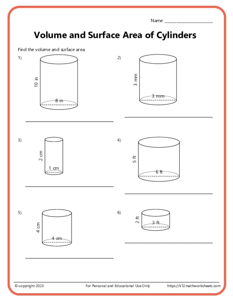 Volume And Surface Area Of Cylinders K12 Math Worksheets
