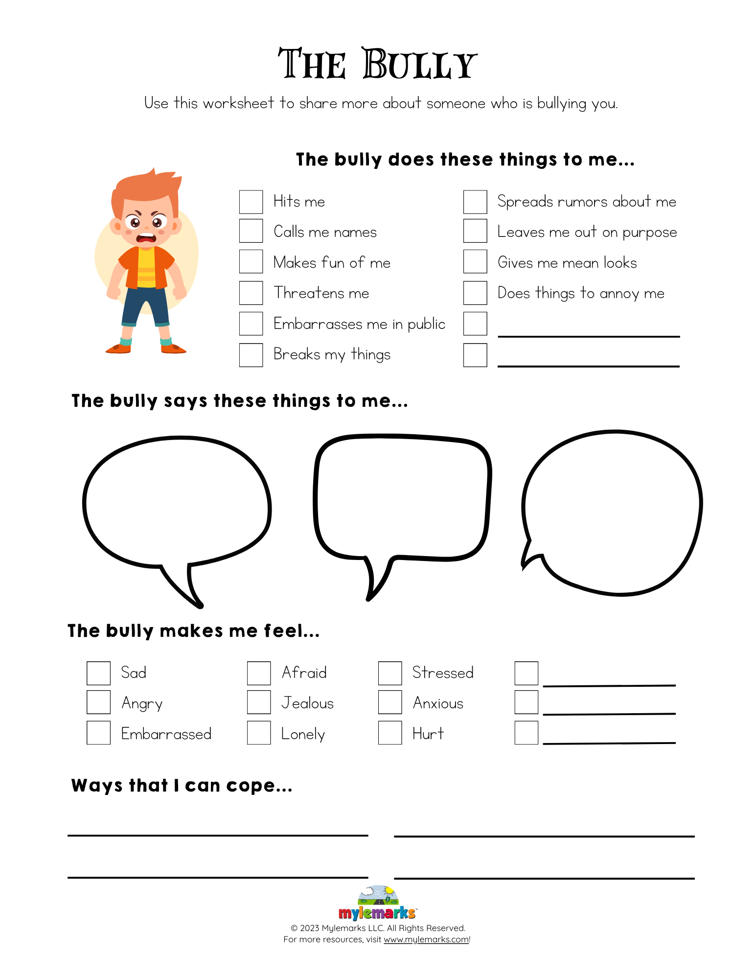 These free printable worksheets cover a range of topics related to bullying, such as defining what bullying is, recognizing different types of bullying, understanding the effects of bullying on individuals, and learning strategies to prevent and respond to bullying incidents. The worksheets are age-appropriate and can be used with children of all ages.